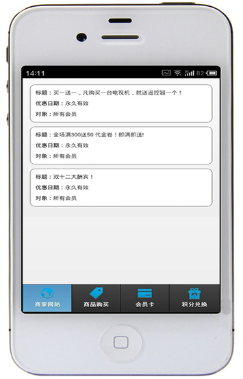 1.列表:在首頁(yè)點(diǎn)擊優(yōu)惠活動(dòng) 將跳轉(zhuǎn)到優(yōu)惠活動(dòng)列表頁(yè)(如上圖) 所有在后臺(tái)添加的優(yōu)惠消息,將會(huì)顯示在列表中!