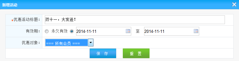 2.優(yōu)惠活動(dòng)對(duì)象:可以設(shè)置優(yōu)惠活動(dòng)的對(duì)象,可以使不同等級(jí)的會(huì)員 (默認(rèn)為所有的會(huì)員)